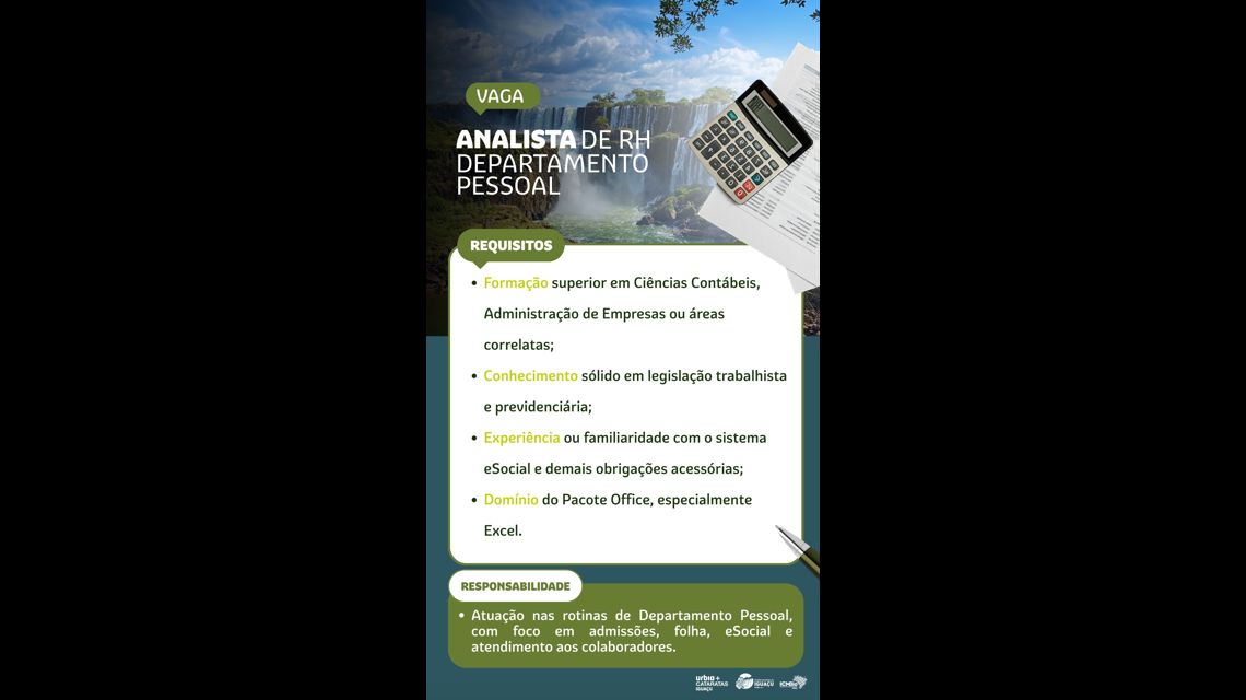 A URBIA CATARATAS S/A, concessionária responsável por gerenciar as operações turísticas do Parque Nacional do Iguaçu, que abriga as Cataratas do Iguaçu, umas das Sete Maravilhas da Natureza em Foz do Iguaçu/PR está buscando um(a) ANALISTA DE RH com foco em DEPARTAMENTO PESSOAL para integrar nossa equipe e contribuir para o crescimento e engajamento dos nossos talentos.