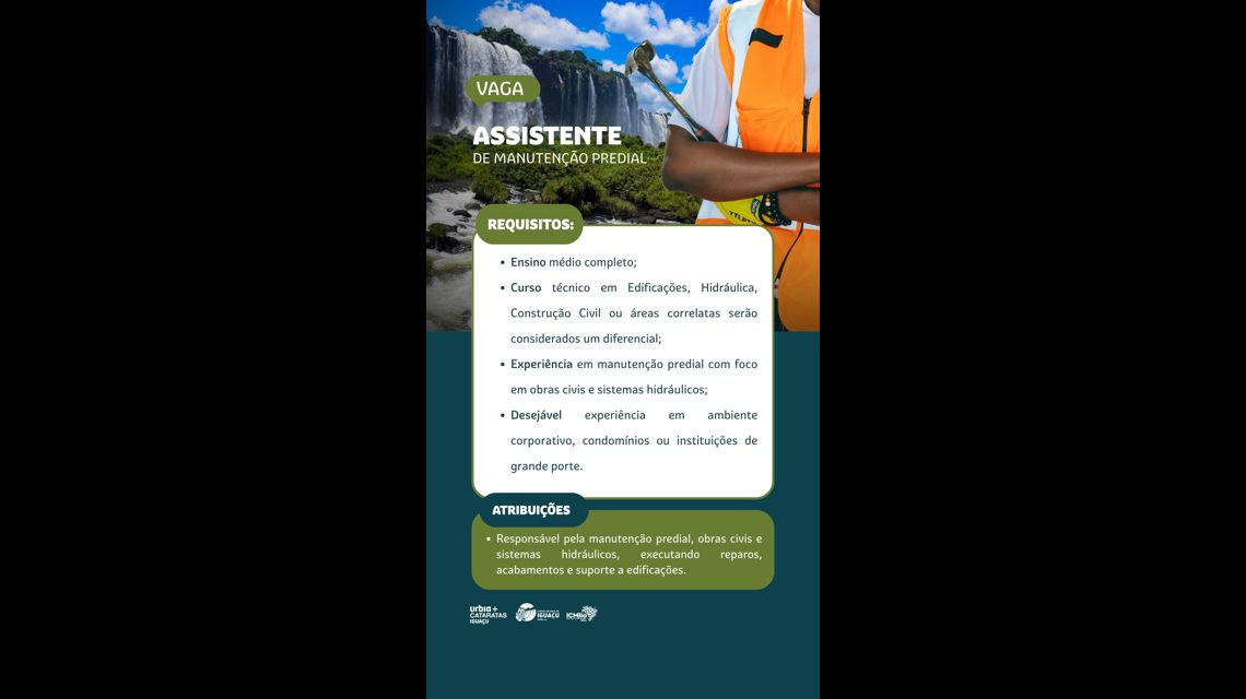 A URBIA CATARATAS S/A, concessionária responsável por gerenciar as operações turísticas do Parque Nacional do Iguaçu, que abriga as Cataratas do Iguaçu, umas das Sete Maravilhas da Natureza em Foz do Iguaçu/PR está buscando um(a) ASSISTENTE DE MANUNTEÇÃO PREDIAL para se juntar a equipe Operacional.