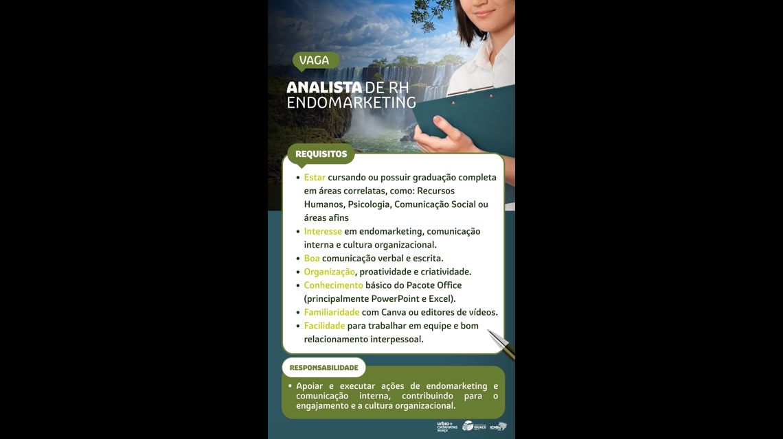 A URBIA CATARATAS S/A, concessionária responsável por gerenciar as operações turísticas do Parque Nacional do Iguaçu, que abriga as Cataratas do Iguaçu, umas das Sete Maravilhas da Natureza em Foz do Iguaçu/PR está buscando um(a) ANALISTA DE RH com foco em ENDOMARKETING para integrar nossa equipe e contribuir para o crescimento e engajamento dos nossos talentos.